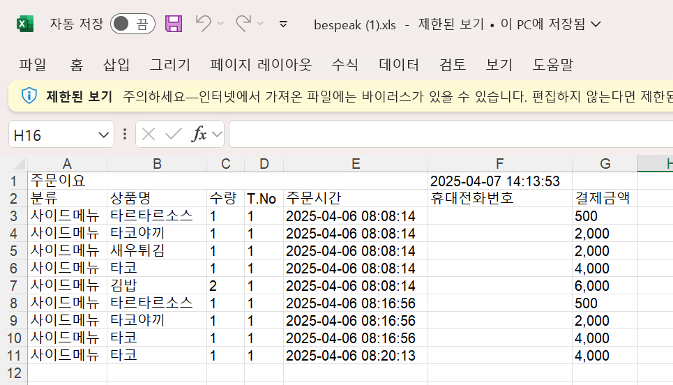 판매 현황을 공유 하면 엑세로 만들어진 판매 보고서가 메일등으로 전달 됩니다.
