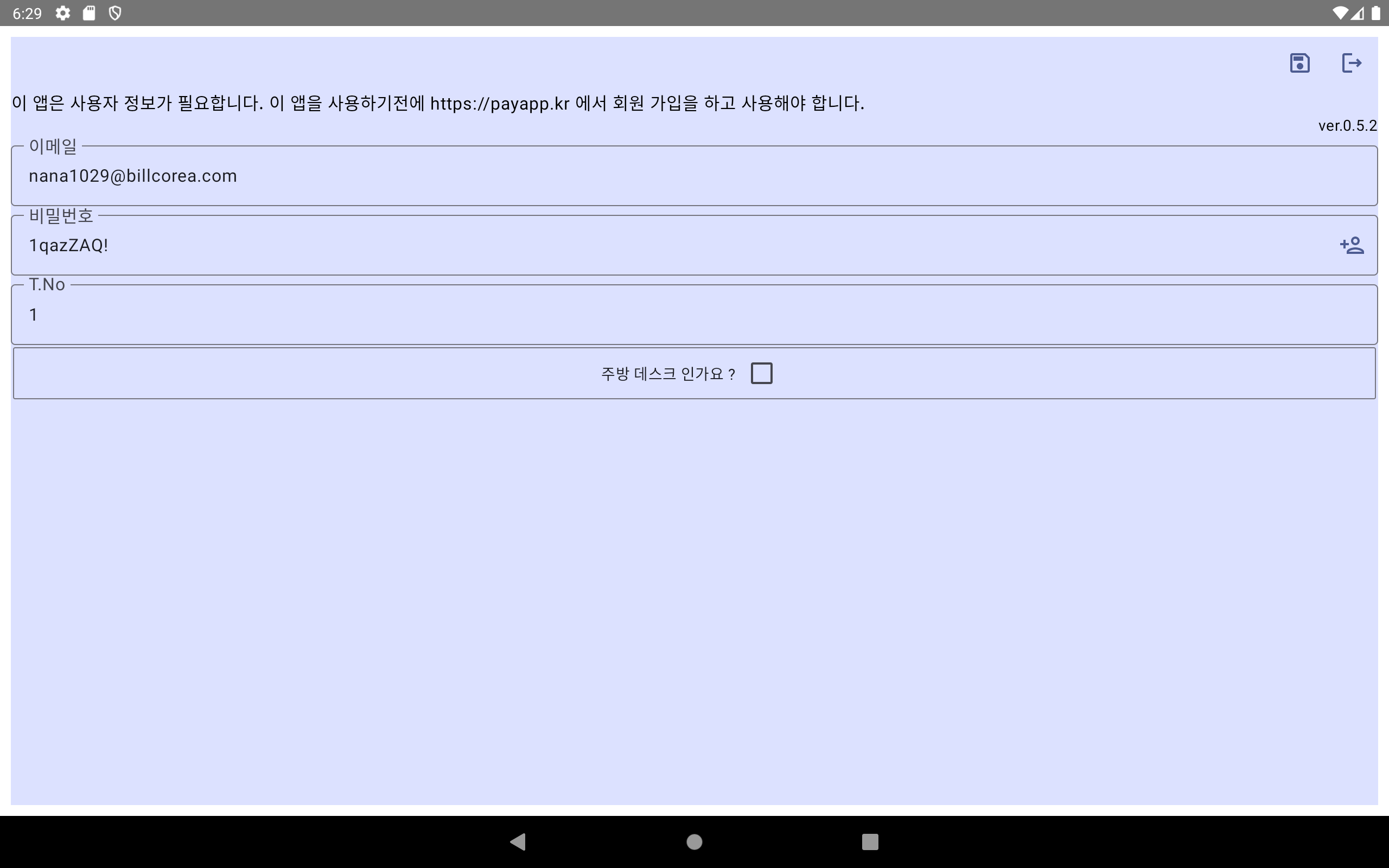- 이 앱을 사용 하기 위해서는 최초 설치시 사용자 등록을 요청 받게 됩니다. 그 때 입력한 이메일 주소/ 기본 비밀번호가 조회 됩니다.