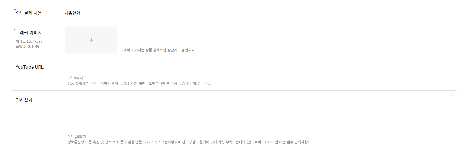 그 다음은 그래픽 이미지을 등록해야 하는데, 이미지 규격을 맞쳐주지 않으면 등록이 되지 않으니 반드시 이미지 규격을 확인해서 맞게 해 주어야 한다. 구글에서는 사이즈 범위로 체크를 하던데 여기서는 꼭 사이즈를 1024 * 578 로 해 주어야 등록이 되니, 주의 하여야 한다.
