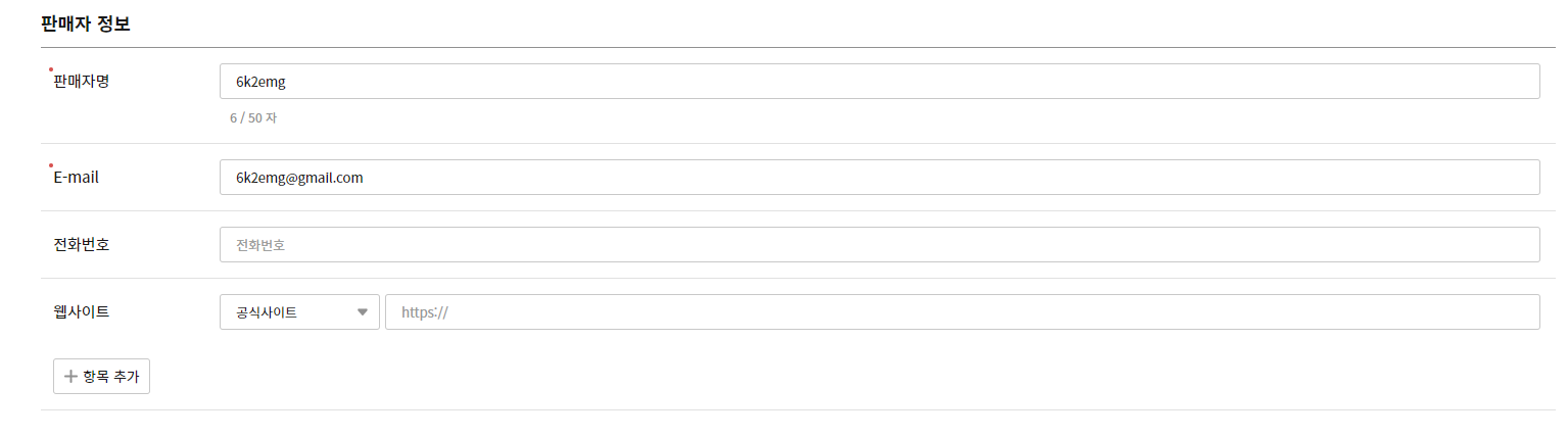 끝으로 판매자에 대한 정보를 기술하면 일단은 완료.. 전부 입력을 했다면, 화면 상단으로 가서 저장을 클릭한다.