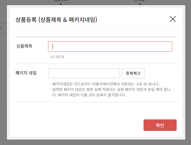 나의 앱 package name 을 입력하고 중복 체크를 클릭해서