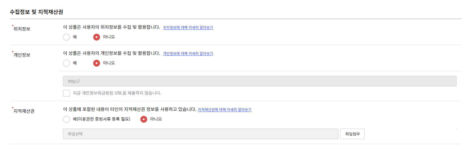 앱에서 사용하는 위치정보가 있는 경우, 개인정보를 습득 하는 경우 이 부분에 대한 안내를 먼저 해야 한다. 나는 없으니 없다고 선택했다. 지적재산권은 타인의 개발한 기능을 이용하는 경우 표시를 해 두어야 한다.