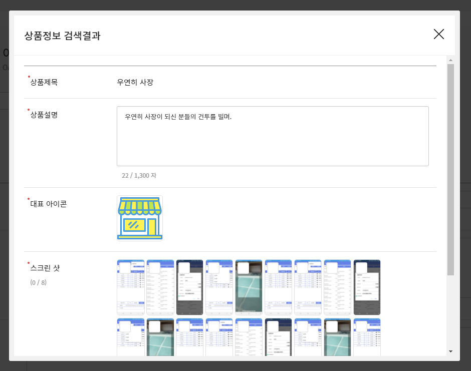 대표 아이콘은 앱을 개발할 때 사용했던 icon 이미지를 설정해 주면 되고, 동영상은 mp4 파일 만들어 두었다면 그것을 올려 주면 된다. 앱의 기능 설명이 들어 있어야 한다. 스크린 샷은 8개 까지만 올리는 수 있으므로 대표 이미지가 될 것 같은 이미지들로 올려 주면 된다. 해상도 제한은 1300 * 1300 dpi 이하이면 되므로 playstore 등록시에 사용했던 이미지 파일을 그대로 가져와서 사용하면 된다.