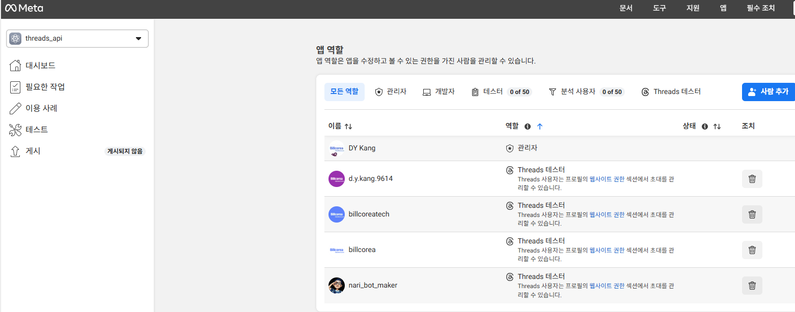 ** 테스트을 위해서는 테스터 등록을 해야 합니다. 또한 등록된 테스터의 계정에서 승인 해야 하는 데, 내가 관리 하는 계정의 경우