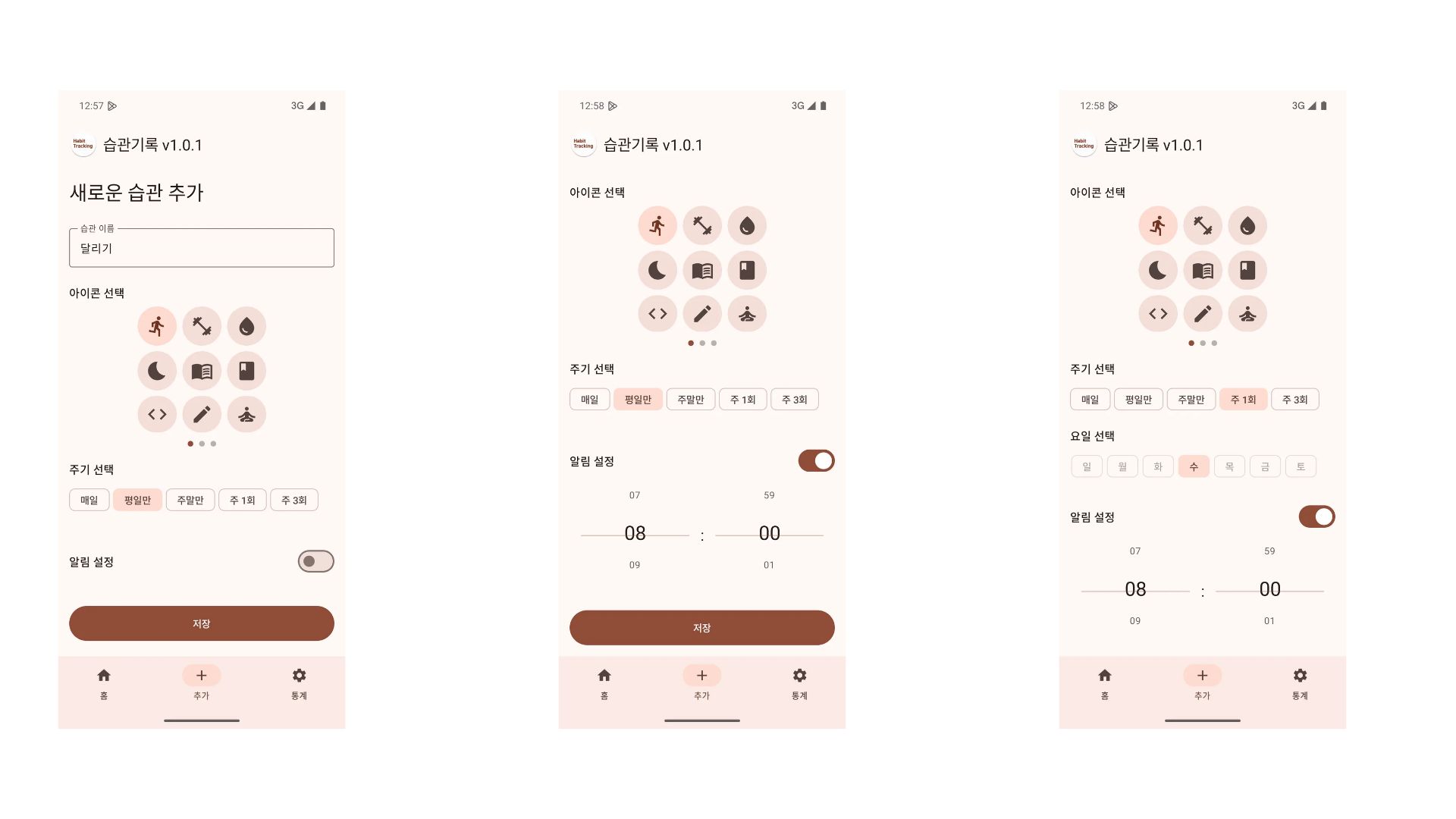 이 화면에서는 홈 화면에서 수정으로 들어 오면 수정을 진행하며, 홈 화면에서 추가 메뉴를 통해 들어 오는 경우 새로운 습관 정보를 기록 합니다.