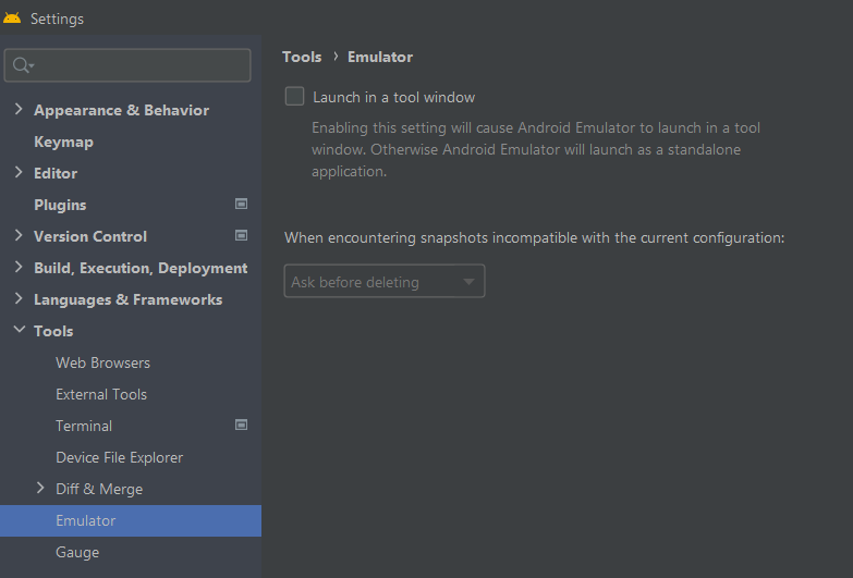 대신 별도의 창에서 에뮬레이터를 실행하려면 파일 > 설정 > 도구 > 에뮬레이터로 이동하고 도구 창에서 시작을 선택 취소합니다.