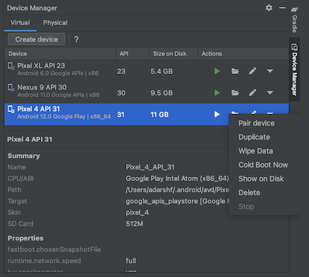 The Device Manager is a stand-in replacement for the AVD Manager, both from Android Studio’s Welcome Screen or after you open a project. The Device Manager introduces some new capabilities that make this feature more easy to create and manage all of your local test devices, such as a flexible tool window, separate tabs to manage your virtual and physical devices, and details of each connected device.