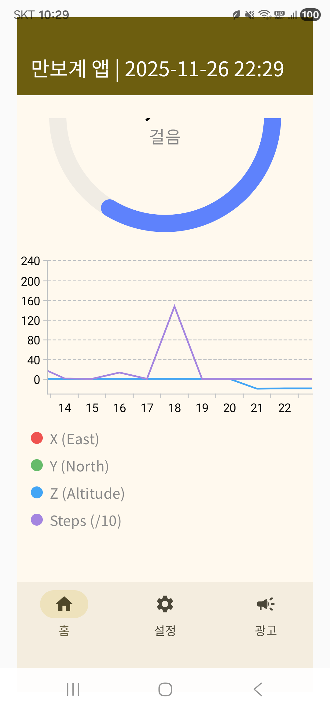 - 메인 화면: 걸음수 단일 지표 + 단일 라인(원 단위)로 깔끔하게 표시.
