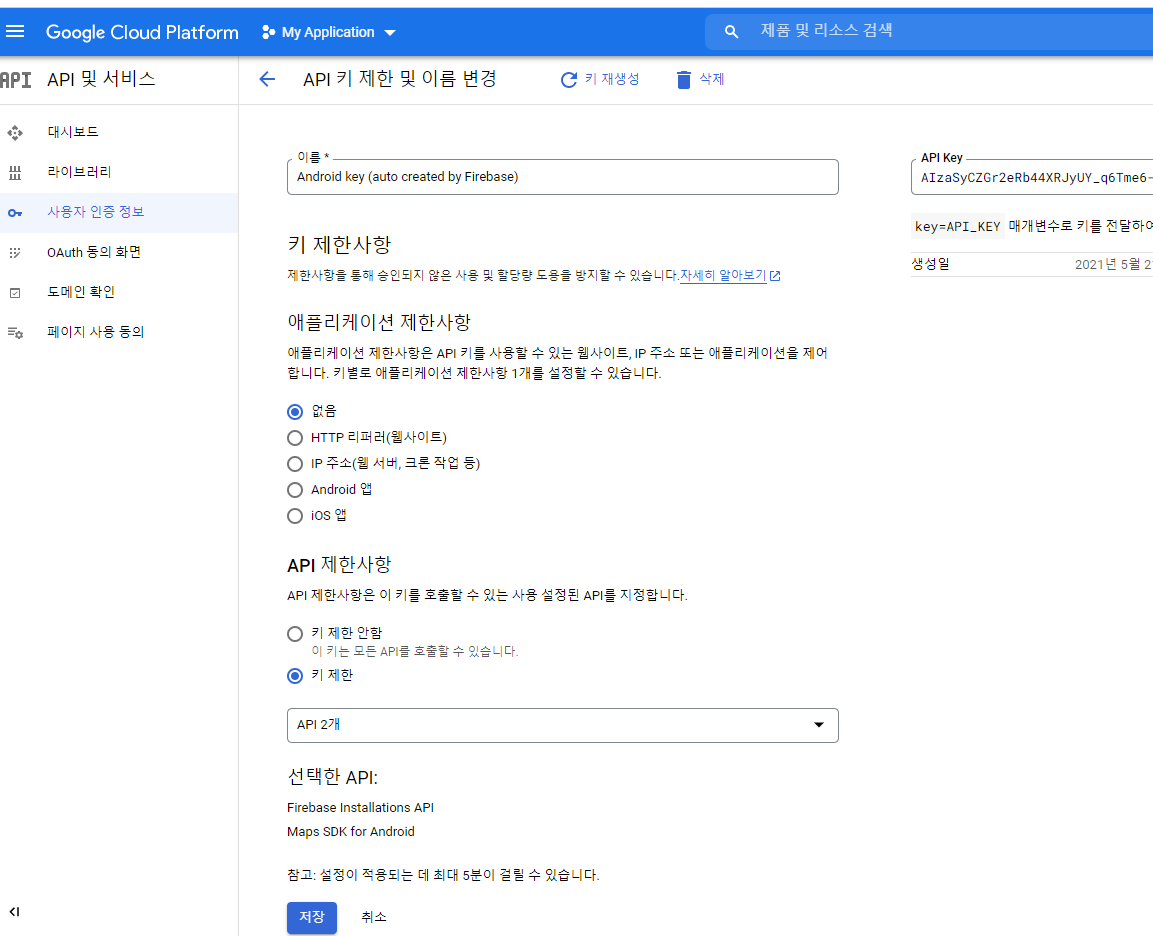 그래서 이번에는 애플리케이션 제한사항은 설정하지 않았다. 다만, api 제한 사항을 선택해서 maps sdk 와 firebase 부분만 선택해서 사용하는 것으로 설정하고, api key는 오른쪽 상단에 있는 apikey을 복사해서 manifest 파일에 등록해 주었다.