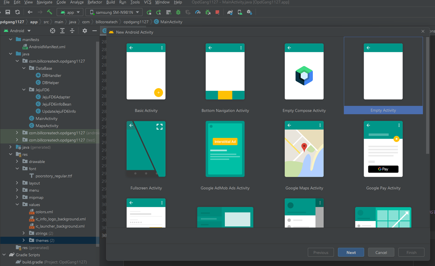 여러 종류의 activity 가 있는데, 그 중에서 지도가 들어있는 maps 을 선택하면 기본적인 설정은 android studio 가 해 준다.