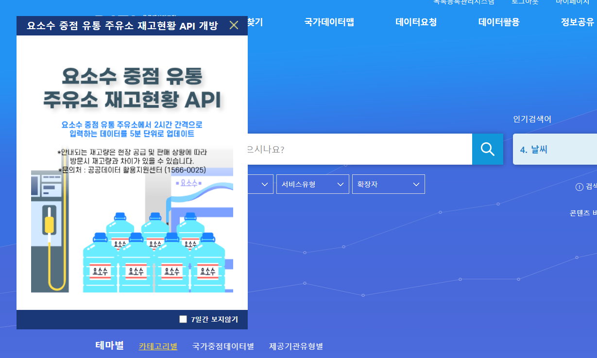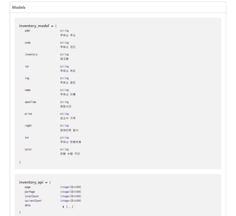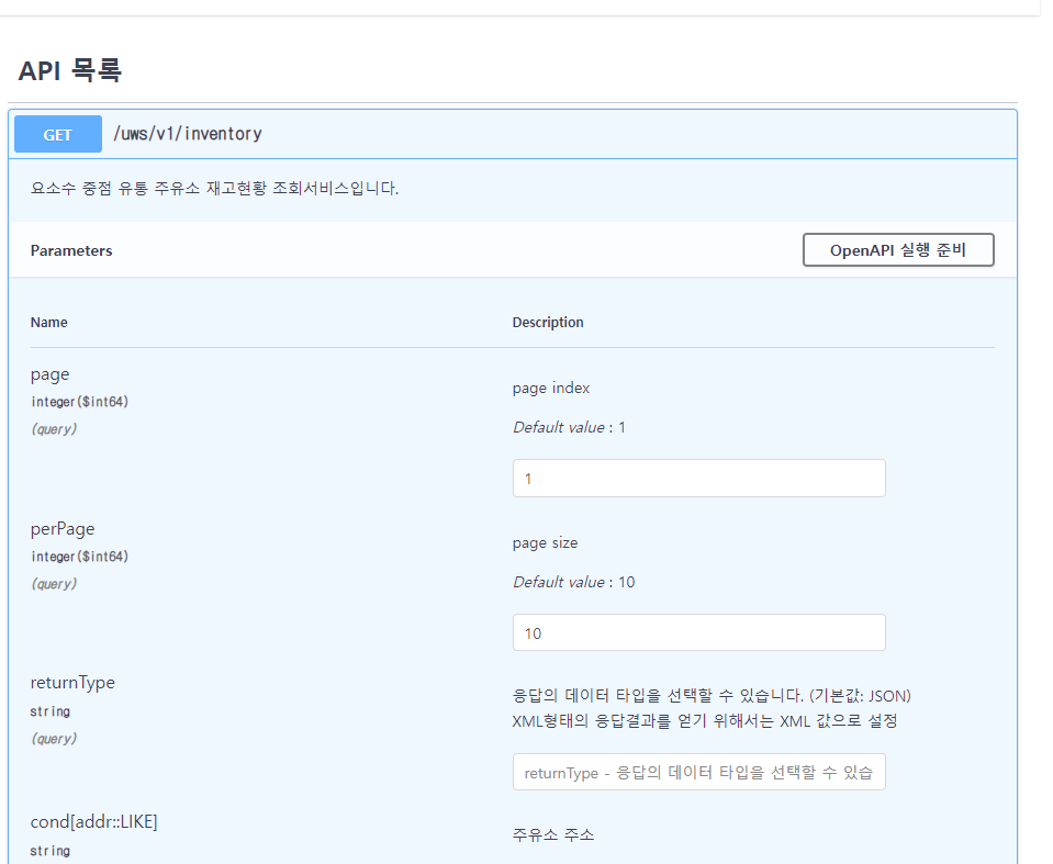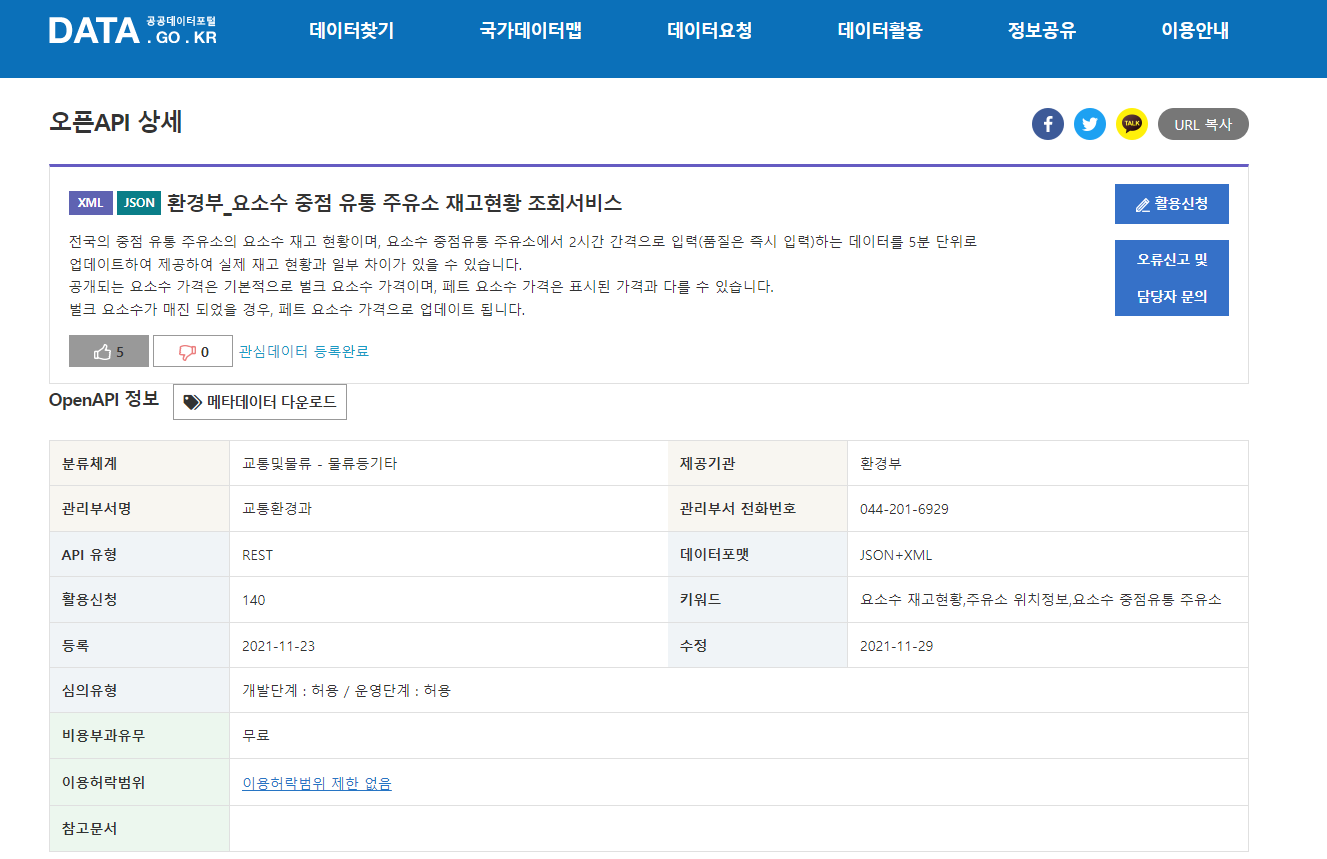 data.go.kr 을 접속해 보면 위와 같이 요소수 중점 유통 주유소 재고현황 API에 대한 활용 정보가 제공되고 있음을 알 수 있다. 저 팝업을 클릭해 들어가 보면 활용에 대한 정보를 볼 수 있다.