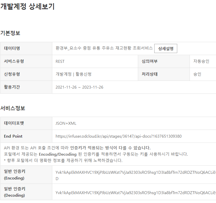 활용신청을 클릭해 보자. 신청 단계는 사용신청 사항을 입력해서 확인을 진행하게 되면 바로 처리가 되고 있어서 자세한 설명을 접어 두고 신청 후 화면을 보면 아래와 같이 일반 인증키가 2개 보이는데, source 작성 시에는 decoding 된 것을 가져다가 source 작성 시에 encoding 해서 전달하는 방식으로 처리를 하면 좋을 것 같다.